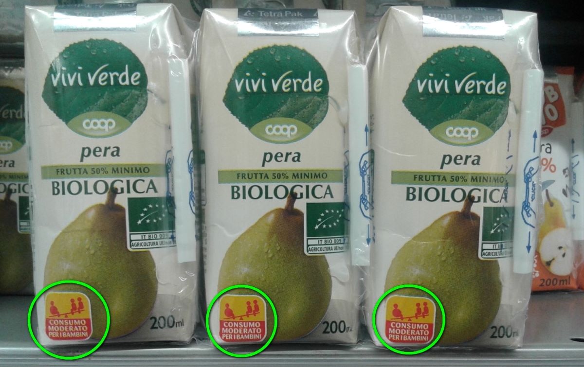 Vediamo a titolo di esempio la confezione di un prodotto destinato ai bambini, dove l’enorme quantitativo di zucchero viene addirittura segnalato dal produttore stesso attraverso un bollino in evidenza sul frontale della confezione raffigurante un bambino obeso, con una scritta di avvertimento per i genitori che li invita ad un uso moderato del prodotto. Questo succo viene venduto in piccolissimi brik da 200 ml, comodi per le mamme da dare ai propri figli per la merenda a scuola ma micidiali per il loro contenuto di zucchero: pensate, ogni brik contiene ben 29 grammi di zuccheri semplici totali tra quelli della frutta e quelli aggiunti dal produttore, una quota pari a 6 cucchiaini di zucchero.