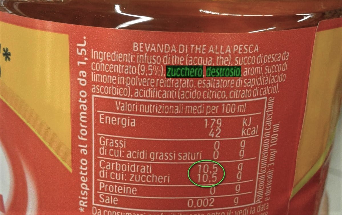 Tutti questi tè in bottiglia in commercio non sono semplicemente composti di acqua ed estratti di foglie di tè, come ci si dovrebbe aspettare. Al contrario sono tutti addizionati di zucchero in grande quantità, vi sono aggiunti inoltre sempre i correttori di acidità, che servono proprio al fine di controbilanciare la percezione eccessivamente dolce della bevanda. Senza il correttore di acidità la bevanda apparirebbe al palato stucchevole ed eccessivamente dolce. Con il correttore, la bevanda è ancora eccessivamente dolce ma il consumatore non se ne accorge. Nei tè freddi in commercio ci sono almeno 100 grammi di zucchero per 1 litro di bevanda: una bottiglia da 1,5 L presenta dunque la incredibile quantità di 150 g di zucchero, pari a 30 cucchiaini.