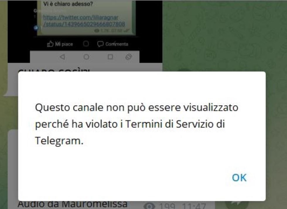 «Questo canale non può essere visualizzato perché ha violato i Termini di Servizio di Telegram», questo messaggio accoglie ora chi cerca di entrare nel canale Telegram “Basta Dittatura” che contava oltre 40.000 iscritti ed era uno dei più radicali nella galassia dei canali “no green pass” italiani. In alcuni messaggi il portale di messaggistica così giustifica la decisione di fronte alle proteste degli utenti: «il canale incitava alla violenza, questo è un fatto. E voi immaginate l’Italia come se fosse una dittatura illegittima, cosa che sicuramente non è». Si tratta del primo canale in lingua italiana bannato da Telegram, fino ad oggi considerata del tutto al riparo dalla censura dei contenuti.