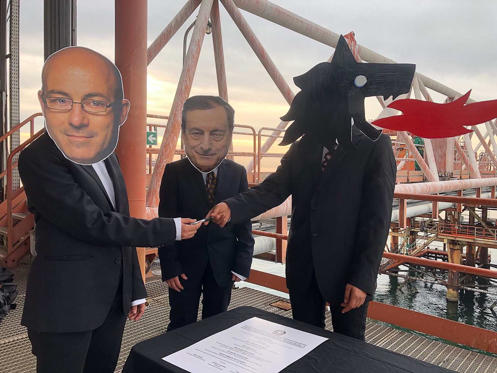 Indossando maschere con i volti di Draghi, Cingolani e il cane a sei zampe di Eni, gli attivisti e le attiviste hanno firmato un simbolico “Patto della finzione ecologica” e hanno esposto striscioni con scritte come “Basta bugie di Eni: nascondere CO2 non salva il clima” e “CCS: ennesima bugia di Eni”. L’intenzione di Eni sarebbe infatti realizzare il CCS (ovvero un sistema di cattura, stoccaggio e riutilizzo della CO2) a Porto Corsini, progetto per il quale ha previsto di investire circa un miliardo di euro, possibilmente utilizzando fondi pubblici. Il CCS porrebbe rimedio alle emissioni industriali di CO2, secondo Eni non risolvibili mediante la transizione a tecnologie elettriche o sostenibili. I giacimenti adriatici esauriti, in particolare quelli al largo di Ravenna, sarebbero riconvertiti in punti di stoccaggio dell’anidride carbonica. La produzione industriale di CO2 sarebbe quindi stoccata sottoterra, dopo essere stata compressa sino ad essere trasformata in stato liquido. Oltre alla difficoltà di prevederne le conseguenze ambientali, un tale sistema sembra essere costruito ad hoc per favorire gli interessi economici di Eni.