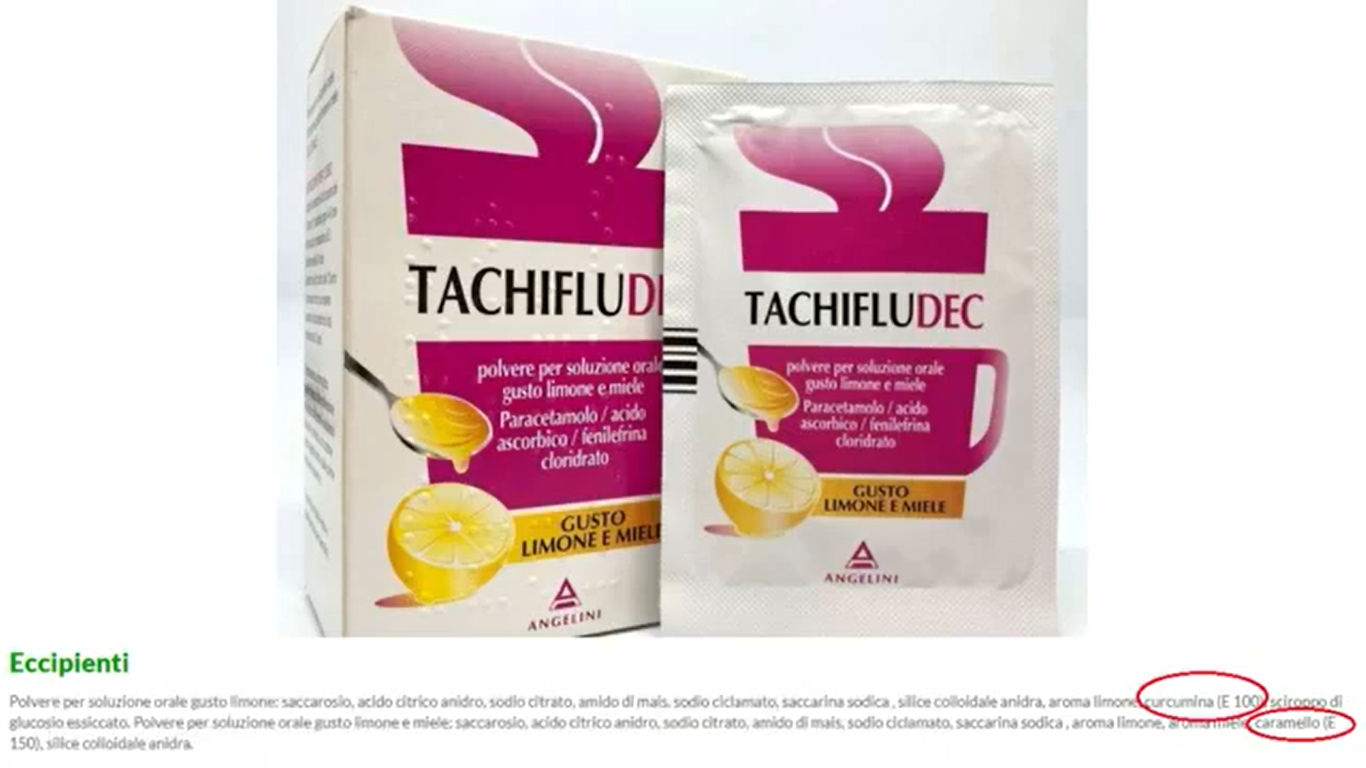 Questo colorante in realtà non è così innocuo come sembrerebbe, in particolare perché l’industria aggiunge per esempio l’alluminio a questo colorante, prima di inserirlo in vari alimenti, ma di tale alluminio non si ha traccia nella lista ingredienti, come vedremo. Si tratta di una sostanza regolamentata nella UE dai regolamenti che disciplinano l’utilizzo di tutte le sostanze ad uso alimentare. Ma è un colorante utilizzato anche in ambito farmaceutico, per rivestire e colorare le compresse dei farmaci, si usa inoltre in ambito tessile, e viene usato anche dall’industria della cosmesi. Se noi facciamo una ricerca in rete inserendo nel motore di ricerca le parole chiave “curcumina E100” e cliccando su Immagini, quello che otteniamo tra i risultati è sempre una foto che raffigura la radice fresca del tubero della curcuma, con a fianco il suo derivato in polvere essiccata (la curcuma in polvere appunto). Sappiamo da tanti studi che la radice della curcuma è un prodotto alimentare ricchissimo di proprietà nutrizionali, 100% naturale, e dunque molto salutare. Questo fintanto che tale radice fresca (o essiccata) non venga però trasformata e alterata da lavorazioni chimiche e trattamenti che ne prevedano una sostanziale trasformazione.