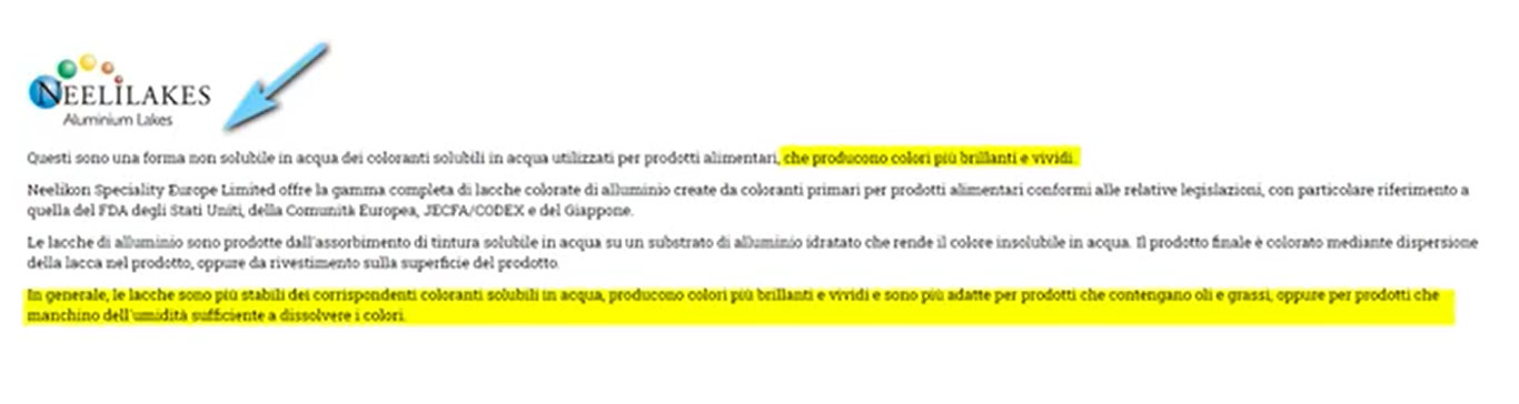Infine veniamo alla questione dell’alluminio aggiunto in questo colorante. Come potete vedere nell’immagine precedente, la parte evidenziata in giallo del regolamento UE 231 autorizza l’uso dei pigmenti di alluminio del colorante curcumina. Perché si aggiunge l’alluminio? Per ottenere le lacche di alluminio (Aluminium lakes), molto utilizzate dall’industria edile ma come vedremo anche da quella alimentare, al fine di ottenere innanzitutto colori più brillanti e vivaci (una sorta di verniciatura metallizzata, se volessimo fare un parallelo con le vernici delle automobili), eppoi al fine di rendere più resistente il colore alle variazioni di umidità e calore, che porterebbero allo scioglimento e dispersione del colore. Esiste pertanto una vera e propria industria chimica di aziende che producono le lacche di alluminio, destinate ai settori tessili, della verniciatura edile vera e propria, della cosmesi, del settore farmaceutico e alimentare.