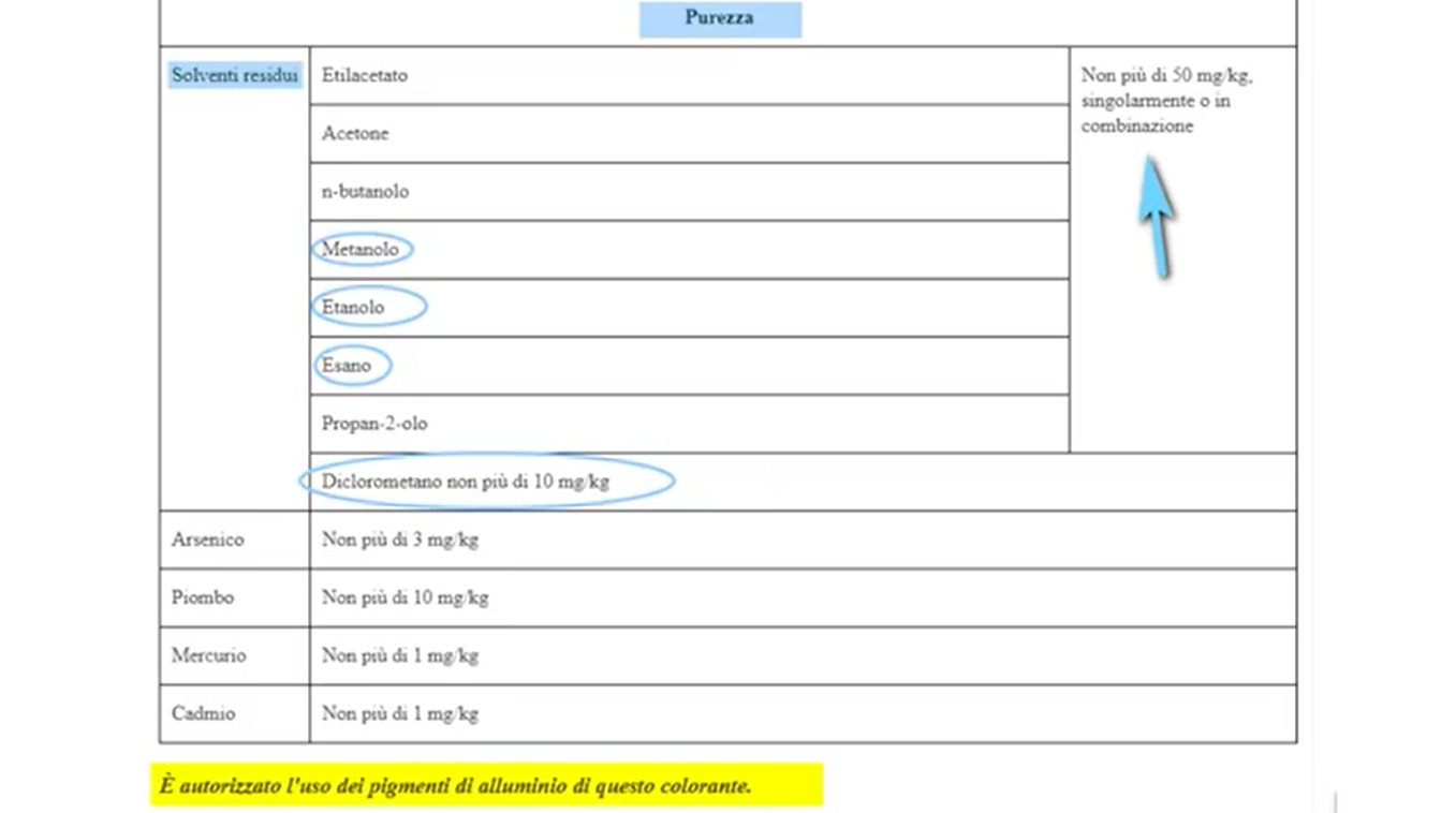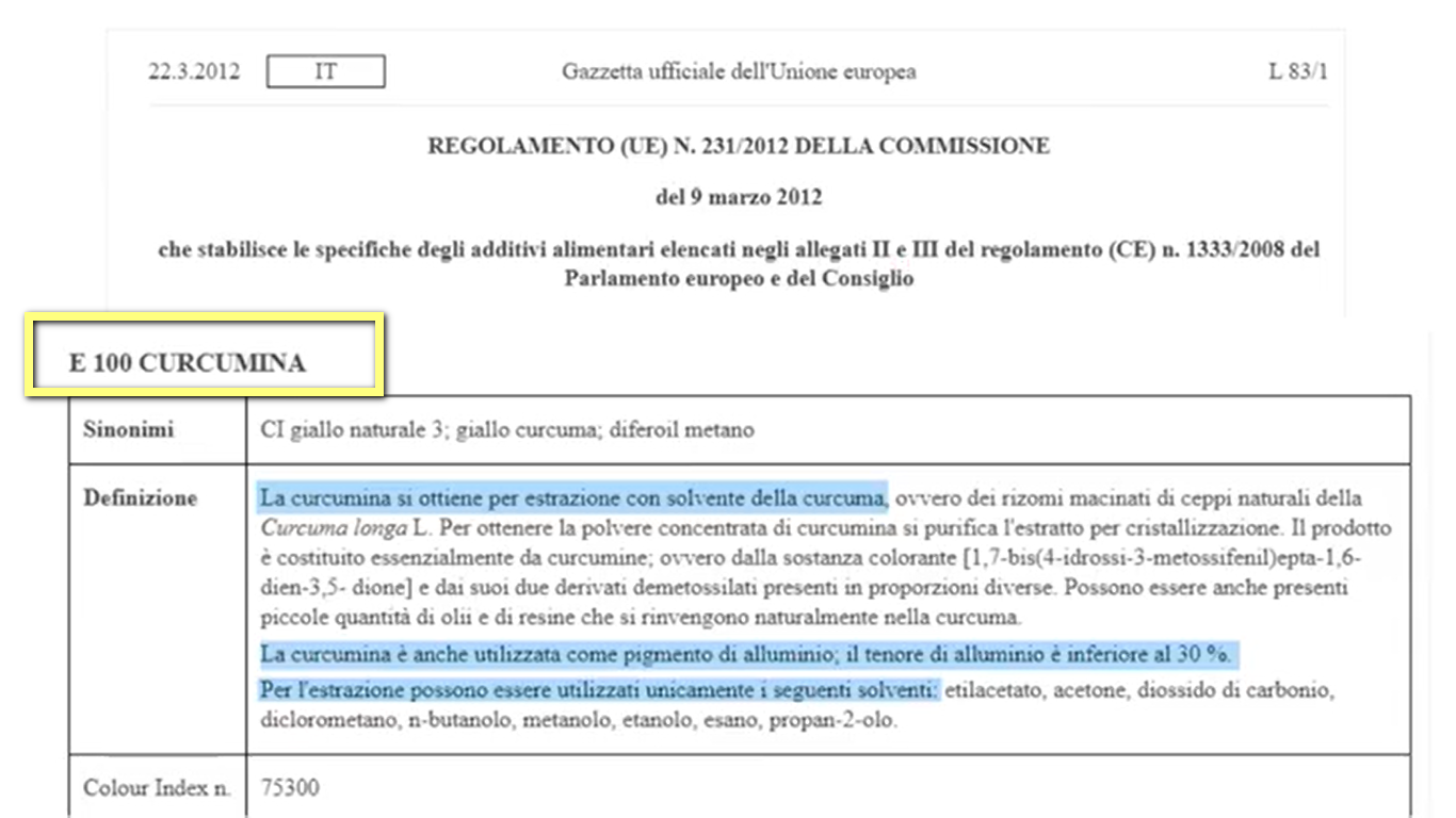 Guardando poi ancora più nel dettaglio la scheda tecnica presentata nel Regolamento UE N°231 del 2012 della Commissione europea, che disciplina tutti gli additivi alimentari consentiti nell’Unione europea, vediamo che nella parte sulla purezza chimica di questo colorante, che si ritiene un aspetto molto importante da disciplinare proprio perché la curcumina viene contaminata durante l’estrazione con i solventi tossici, si stabilisce che non possa residuare più di 50 milligrammi di solventi chimici nel prodotto finale. Addirittura nel caso del solvente diclorometano non deve rimanere più di 10 mg di residuo, proprio perché si ritiene che la sua tossicità sia elevata.