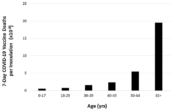iii) Le reazioni avverse: Lo studio considera gli effetti collaterali riportati nel VAERS (Vaccine Adverse Events Reporting System), il programma statunitense di monitoraggio della sicurezza dei vaccini. Il 24 Maggio 2021, il VAERS aveva ricevuto 4.863 rapporti di decessi (0.0017% dei vaccinati). Il 15 Giugno i rapporti avevano già raggiunto circa 6.000 casi. Il numero reale potrebbe essere molto superiore, dato che gli autori specificano che storicamente il VAERS riporta circa l’1% degli effetti collaterali [10]. Il 60% dei decessi è avvenuto entro una settimana dalla vaccinazione. Un dato estremamente preoccupante è che mentre i decessi per covid-19 tra i bambini e i giovani sono statisticamente trascurabili (Figura 2), i decessi per gli effetti collaterali non lo sono (Figura 3)! Uno studio dell’università della California (ancora in fase di valutazione) e uno studio danese, hanno evidenziato che il vaccino della Pfizer può provocare miocardite e pericardite negli adolescenti, i quali hanno considerevolmente più probabilità di venire ospedalizzati a causa di questi effetti avversi, rispetto che a causa del covid-19 [11,12].