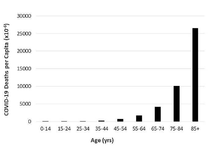 Figura 2. Decessi per covid-19 pro capite registrati negli USA fino al 5 Giugno 2021, suddivisi per fascia d’età (tratto da Kostoff et al., 2021).