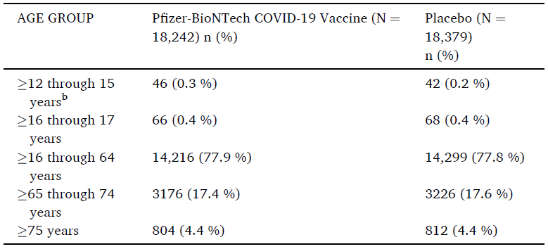 Figura 1. Numero di partecipanti allo studio di sicurezza ed efficacia del vaccino della Pfizer suddivisi per fascia d’età, che hanno assunto il BNT162b2 o il placebo (tratto da Kostoff et al., 2021).
