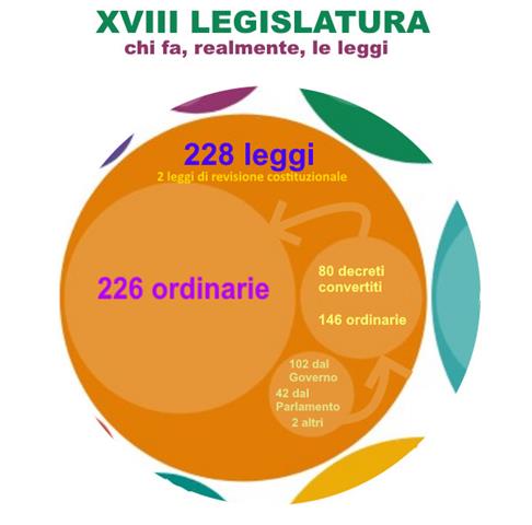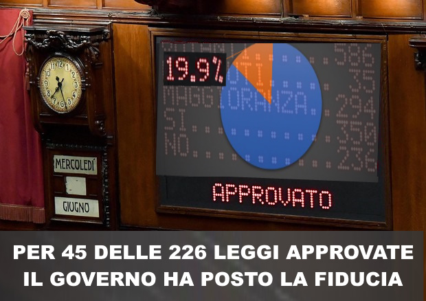 Per l’approvazione di 45 delle 226 leggi ordinarie il Governo ha fatto ricorso, in almeno un ramo del Parlamento, alla posizione della questione di fiducia (in 26 di questi 45 casi la fiducia è stata posta in tutti i passaggi parlamentari). Tra leggi frutto di conversioni di decreti, di iniziativa governativa, decreti-legge e decreti legislativi siamo ormai al punto in cui il Governo fa e disfa a piacimento. Il Parlamento, si può dire, non tocca palla. E, forse, non “parlamenta” neanche più vista la quantità di “questioni di fiducia” che, tra l’altro, vengono poste sui temi più delicati e politicamente rilevanti. Secondo la Costituzione il Parlamento dovrebbe fare le leggi e il Governo, di fatto, renderle esecutive e applicarle. Ma, da lungo tempo la logica dell’emergenza ha fatto sì che il Governo, attraverso i decreti legge, abbia finito per sovrapporsi al Parlamento – alla Camera e al Senato – e abbia sfornato centinaia di decreti legge nel giro di una mezza legislatura.