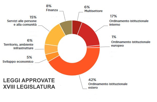 Durante la presente legislatura, dal 23 marzo 2018 al 31 ottobre 2021, sono state approvate 228 leggi: due leggi di revisione Costituzionale di iniziativa parlamentare (la legge costituzionale n. 1 del 2020 di riduzione del numero dei parlamentari e la legge n. 1 del 2021, che modifica l’articolo 58 della Costituzione, in materia di elettorato per l’elezione del Senato della Repubblica) e 226 leggi ordinarie (80 leggi di conversione di decreti-legge e 146 altre leggi ordinarie, 102 di iniziativa governativa, 42 di iniziativa parlamentare e 2 di iniziativa mista popolare e parlamentare). Dai governi Conte e Draghi stati emanati anche 114 decreti-legge (26 dal governo Conte I, 54 dal governo Conte II e 34 dal governo Draghi), 115 decreti legislativi e 12 regolamenti di delegificazione.