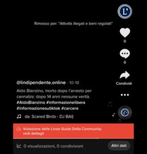 Il primo video in questione – pubblicato lo scorso 18 ottobre e censurato pochi minuti dopo – si basa sul nostro articolo riguardante la vicenda di Aldo Bianzino, morto nel 2007 dopo essere stato arrestato per possesso di cannabis. Siamo stati informati del fatto che la sua rimozione è legata alla categoria «Attività illegali e beni regolati», ragion per cui con ogni probabilità l’algoritmo del social ha censurato il contenuto solo poiché esso conteneva la parola “cannabis”. Ad ogni modo, però, tale rimozione non sembra neanche combaciare perfettamente con la giustificazione fornitaci, all’interno della quale si legge infatti che «non sono consentiti contenuti che rappresentino scambi, vendite, divulgazioni, modalità d’uso di prodotti e altre forme rappresentative di attività criminali» ma che sono consentite eccezioni per diversi tipi di scopi, tra cui quelli «giornalistici». Tuttavia, nonostante il ricorso da noi presentato, il video è tuttora bloccato.