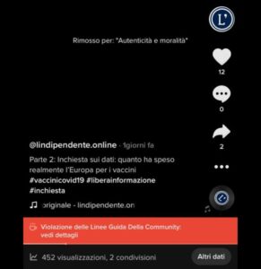 Nell’ultimo periodo il social network TikTok ha rimosso tre video pubblicati dal profilo ufficiale de L’Indipendente: solo uno di essi è stato ripristinato, mentre gli altri due sono tuttora oscurati. La censura del social nei nostri confronti non è terminata qui, dato che in seguito alla rimozione del terzo ed ultimo video avvenuta nella giornata di ieri, la piattaforma video ha sanzionato anche il nostro profilo, impedendoci di pubblicare contenuti fino alle ore 16:51 della giornata di oggi. Tuttavia, le ragioni alla base di tali misure restrittive risultano essere alquanto incomprensibili.