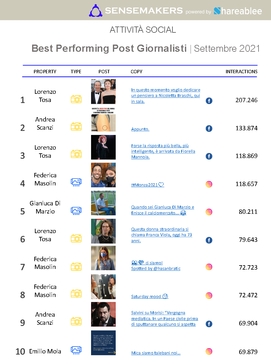Tutti gli altri, dal primo all’ultimo, fanno felicemente e serenamente un altro mestiere. Sono influencer, opinionisti o “opinion makers”, scrittori, cacciatori di fake news, ospiti televisivi, perfino giudici di programmi televisivi. Sono, soprattutto, grandi surfisti dell’onda social, come appunto dimostrano una volta di più queste statistiche pubblicate da Primaonline, la Bibbia dei media italiani.