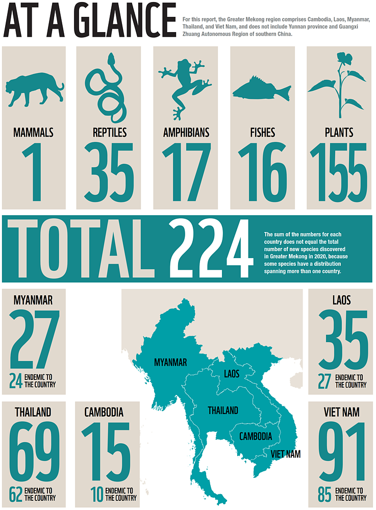 diversità delle specie. È dunque importante essere coscienti della grave perdita che avverrebbe – e già sta avvenendo – con l’insediamento umano e le correlate attività troppo spesso distruttive per l’ambiente circostante. Le specie già estinte prima che potessero essere anche solo riconosciute sono esempio delle conseguenze di una massiccia distruzione dell’habitat. Tra le malattie diffuse dalle attività umane, la predazione e la competizione apportata da specie invasive, gli impatti devastanti del commercio illegale e insostenibile della fauna selvatica, viene sottolineato nel report del WWF, la regione è sottoposta a grave stress e a un enorme rischio. Le nuove scoperte devono quindi essere un modo per comprendere la vitale importanza degli ecosistemi naturali e cercare urgentemente soluzioni migliori per proteggere le specie e l’ambiente. Il WWF denuncia quindi la poca attenzione per la conservazione e la salvaguardia di un luogo tanto importante e unico, il che porta a perdere un’incredibile e variegata ricchezza naturale. Se ci sarà sufficiente appoggio da parte dei governi, delle comunità locali, delle ONG e della comunità scientifica con sforzi collettivi di conservazione, il Grande Mekong potrà continuare a essere la culla di tanta biodiversità e a sorprendere, proprio come ha fatto per tutto il 2020.