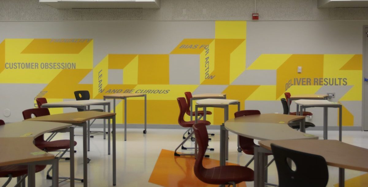 Il percorso di studi viene svolto all’interno di una classe per cui, come detto all’inizio, Amazon ha sborsato 50.000 dollari per i materiali, oltre che per lo studio e l’applicazione di un ambiente che ponesse gli studenti in uno stato di sudditanza al colosso di Bezos. L’aula, colorata con i colori dell’azienda, è ricoperta di scritte sui muri in cui si riportano gli slogan e i principi che ogni lavoratore Amazon deve sapere e rispettare: insomma, sui muri dell’aula vi è la “Bibbia di Amazon”, i “Comandamenti di Bezos”. In occasione dell’inizio dei corsi del 2019, la preside della Cajon High School, Teenya Bishop, come una normalissima dipendente Amazon, è stata fotografata con la polo – la divisa – dell’azienda.