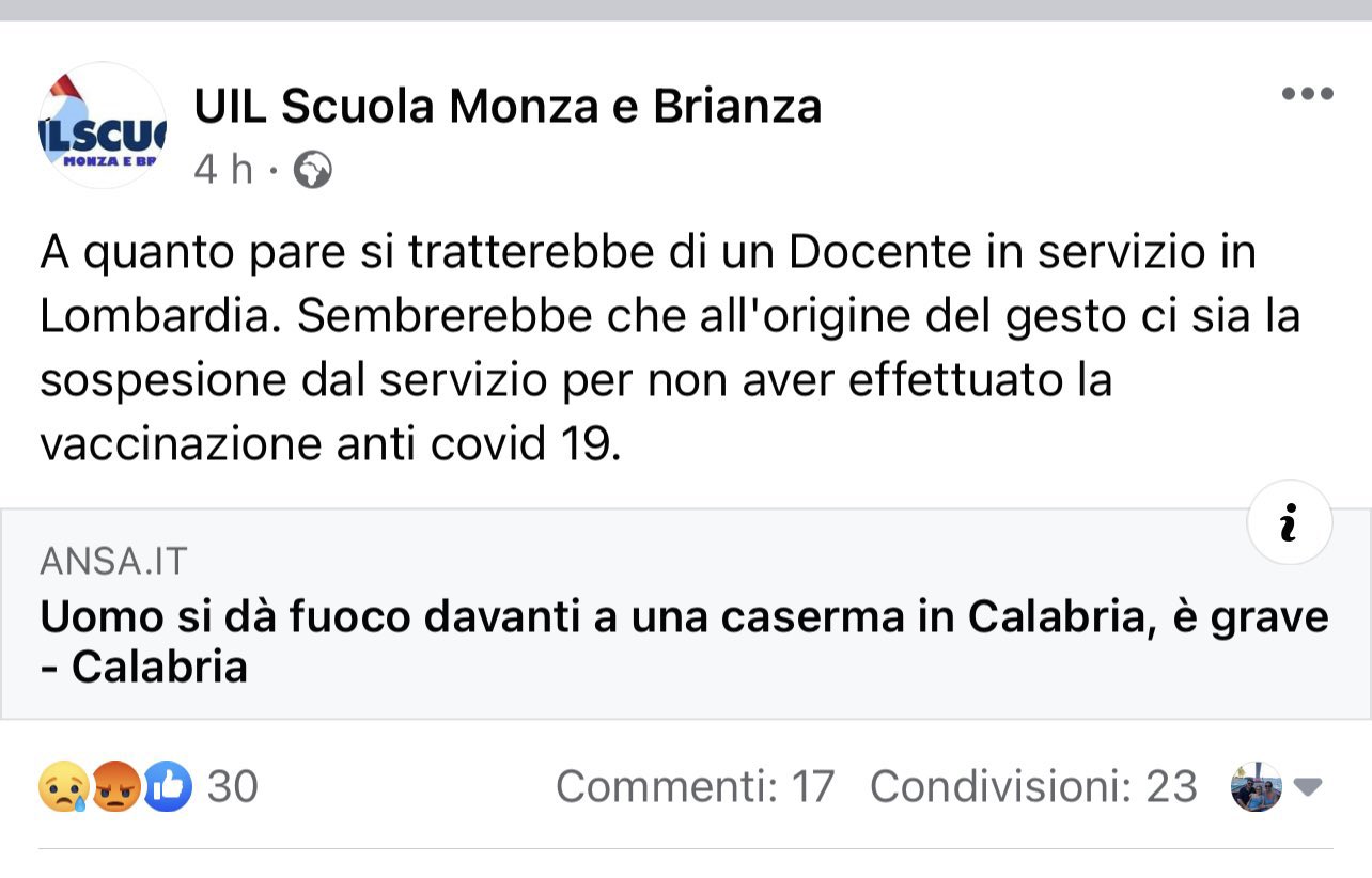 Un insegnante di 33 anni è ricoverato in condizioni gravissime in seguito alle ustioni che si era provocato dandosi fuoco attorno alle ore 10 di ieri, 31 gennaio, davanti alla caserma dei Carabinieri di Rende, in Calabria. Una vicenda dai tratti oscuri, in quello che appare, per il luogo scelto, un evidente atto di protesta. Resa ancor più torbida da una serie di indizi, poi scomparsi, che legavano l’atto ad una protesta a seguito dalla sospensione dal servizio per non essersi vaccinato e quindi per non essere in possesso del super green pass. Questo è quanto avevano affermato i colleghi del sindacato Uil Scuola Monza e Brianza (l’insegnante era in servizio in Lombardia) che in un comunicato su Facebook avevano scritto: “Sembrerebbe che all’origine del gesto ci sia la sospensione dal servizio per non aver effettuato la vaccinazione anti-Covid”. Il messaggio è stato poi rimosso senza spiegazioni, così come nulla trapela sui media, con i principali giornali che non hanno dedicato nemmeno una riga all’accaduto. Anche il portale specializzato in informazione scolastica Orizzonte Scuola, aveva dedicato un pezzo alla vicenda, ma poi ha scelto di rimuoverlo e il link all’articolo riporta ora a una pagina di errore.