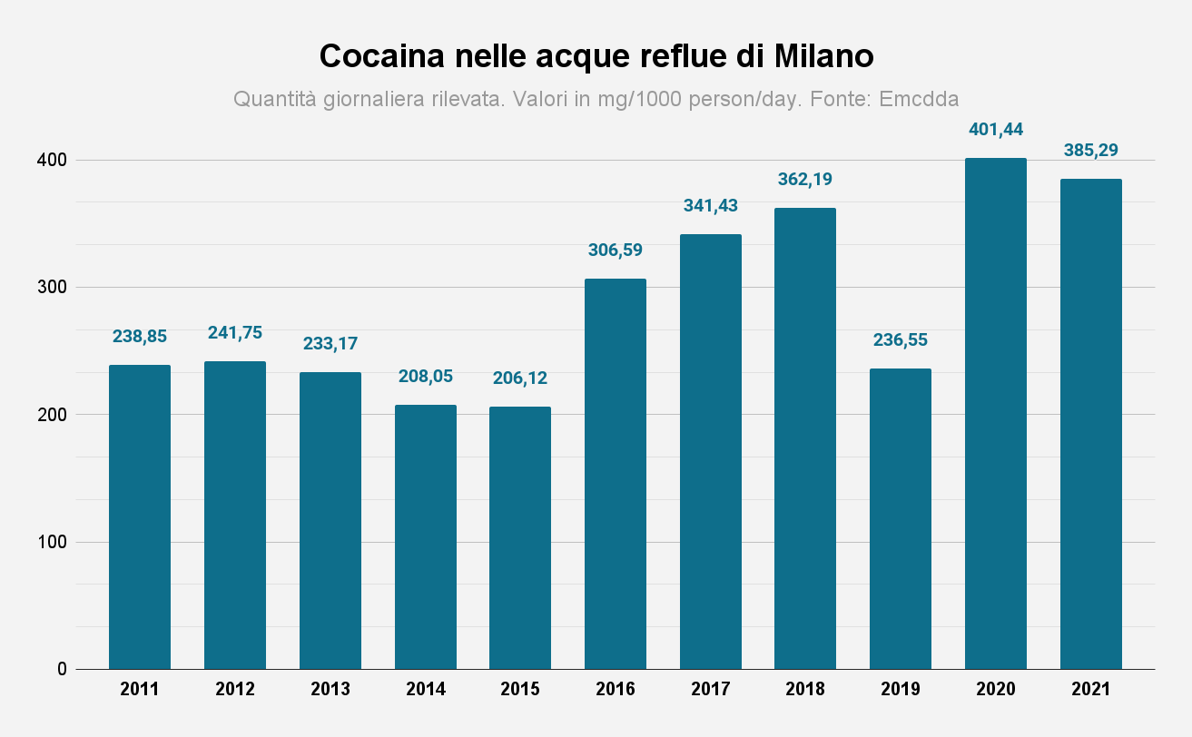 Tra il 2020 ed il 2021 la quantità di benzoilecgonina, ovverosia il principale metabolita della cocaina, rilevata all’interno delle acque reflue di Milano è aumentata rispetto a quella rintracciata negli anni precedenti: è quanto emerso da un recente rapporto della rete di ricerca Score e dell’Emcdda – l’Osservatorio europeo sulle droghe – con cui sono stati analizzati i dati relativi alla presenza di alcune sostanze stupefacenti nelle acque reflue di circa 80 città europee. Nello specifico, per quanto riguarda il 2021, nel report si legge che la quantità media giornaliera di benzoilecgonina per 1.000 abitanti a Milano è stata di 385,29 milligrammi, mentre nel 2020 essa è stata di 401,44 milligrammi. Numeri, questi ultimi, di gran lunga superiori a quelli registrati nel 2019, anno in cui sono stati rilevati 236,55 milligrammi ogni 1.000 abitanti negli scarichi della città.