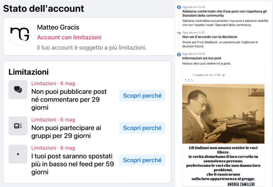 Non mi si venga a dire che Facebook (o Meta che sia) in quanto società privata fa quello che vuole sulla sua piattaforma: questa è una baggianata detta e ripetuta da chi non si rende conto che esiste una Costituzione Italiana, al cui interno c’è un articolo specifico che garantisce la libertà di parola e pensiero e che chiunque – sottolineo chiunque – deve rispettare se vive, agisce o opera sul territorio nazionale, compreso Facebook!