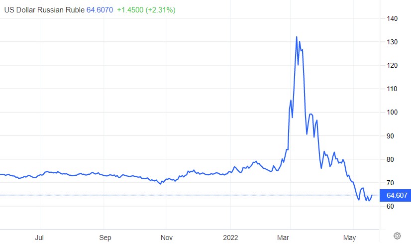 Alla “sconfitta” dell’ambiente, sacrificato per far fronte alle sanzioni rivolte a Mosca, si aggiunge poi la crescita del rublo, a dispetto delle previsioni (e speranze) europee. Il tasso di cambio nei confronti delle maggiori valute mondiali ha raggiunto i livelli pre-pandemia, quando per ottenere un dollaro statunitense erano necessari circa 60 rubli. Dopo aver subito una massiccia svalutazione (di circa il 50%) lo scorso marzo, la moneta ufficiale della Russia ha iniziato una rapida ripresa rappresentando, al momento, la miglior valuta del 2022, con un rimbalzo sul dollaro di circa il 12% da inizio anno.