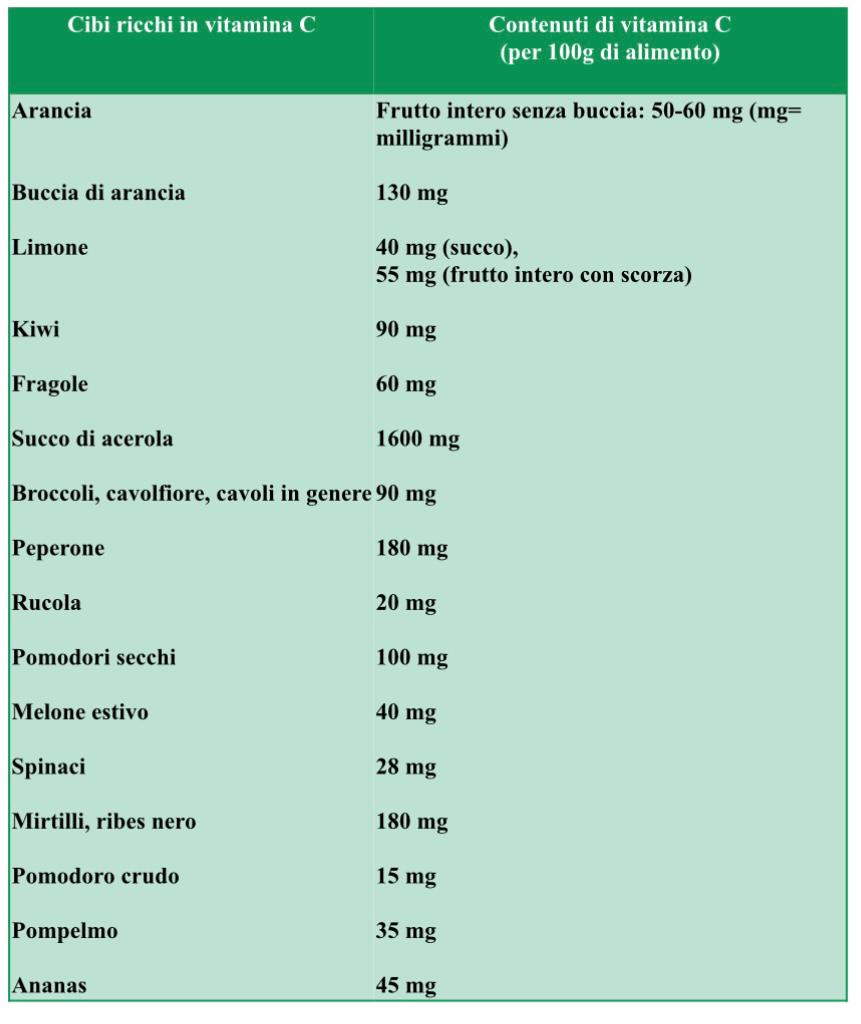 Soffermiamoci proprio sull’acetaldeide perché merita un’analisi precisa che coinvolge anche l’alimentazione. Si tratta di una sostanza tossica che si produce in grandi quantità anche nei bevitori di alcool e in chi mangia troppi zuccheri o troppi carboidrati in genere (ricordo che i carboidrati, durante la digestione, vengono sempre trasformati in zuccheri e finiscono poi in circolo nel sangue, nello specifico in uno zucchero chiamato glucosio). Sia nella digestione dell’alcol che in quella dello zucchero, il nostro organismo effettua una serie di trasformazioni chimiche in cui l’alcol e lo zucchero diventano acetaldeide. Se poi tutto va bene, come succede in una persona sana che assume moderati quantitativi di alcool e di zuccheri (o carboidrati), l’acetaldeide viene ulteriormente trasformata in acido acetico, una sostanza che è salutare per l’organismo (contenuta nell’aceto di vino, nell’aceto di mele, e in qualsiasi altro tipo di aceto). E se le cose vanno in questo modo diciamo che non ci sono problemi di alcun genere. Ma quando una persona assume alcool e zuccheri (o carboidrati) in eccesso, allora il sistema naturale progettato dalla natura per il nostro corpo, con cui trasformare l’acetaldeide (tossica) in acido acetico (salutare), salta completamente e nell’organismo rimangono elevati quantitativi di acetaldeide. L’abuso di alcool e zuccheri origina dunque molti problemi di salute, in particolare tumori (vi sarà certamente capitato di leggere che “lo zucchero alimenta i tumori” o frasi di simile tenore). La vitamina C, che è contenuta in diversi alimenti oltre agli agrumi (si veda la tabella), e altre sostanze come la tiamina (vitamina B1) e la cisteina (un aminoacido contenente zolfo), hanno mostrato negli studi scientifici un’azione protettiva naturale contro l’acetaldeide e i radicali liberi prodotti dal fumo.