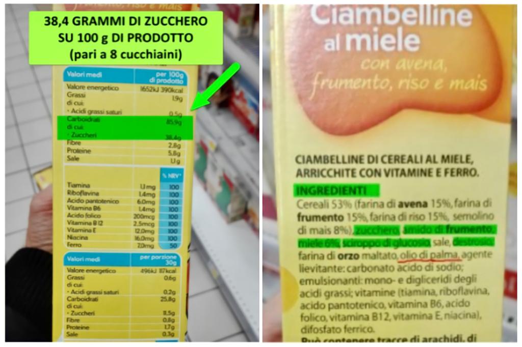 Questo prodotto contiene ben 38,4 grammi di zuccheri aggiunti per 100g di prodotto! Un quantitativo di zucchero impressionante, pari a circa 8 cucchiaini di zucchero. Se consideriamo poi il fatto che il rimanente quantitativo è farina di cereali (frumento, riso, mais e avena) e dunque è costituito quasi esclusivamente da amido, che una volta digerito e assimilato si trasforma a sua volta in zucchero (glucosio), capite bene quanto possa essere scorretto far fare una colazione con un prodotto del genere ai propri figli. Altro che migliorare la loro attenzione e memoria, qui si produce un picco glicemico altissimo, che sebbene inizialmente porterà iperattività e iperstimolazione del sistema nervoso e dell’attenzione, attraverso una forte secrezione di dopamina, in seguito (dopo 2 ore dalla colazione al massimo) i bambini saranno preda di un abbassamento brusco dei livelli di glicemia nel sangue (ipoglicemia reattiva) che li porrà in una condizione di stanchezza, svogliatezza, noia e in definitiva irrequietezza e nervosismo, in quanto tale condizione metabolica porta a cercare altro cibo, in particolare altro zucchero o cibi a base di carboidrati. Una condizione mentale che non può certamente favorire concentrazione e buon rendimento scolastico. Per brevità non ho allegato anche tutte le altre foto di prodotti simili di altre marche, che ho analizzato al supermercato. Ad ogni modo, l’intera categoria di cereali confezionati per la colazione segue questi criteri di preparazione e composizione e questi prodotti hanno tutti altissimi quantitativi di zucchero aggiunto, non meno di 20 g di zucchero aggiunto su 100g, pertanto non meno di 4 cucchiaini di zuccheri aggiunti.