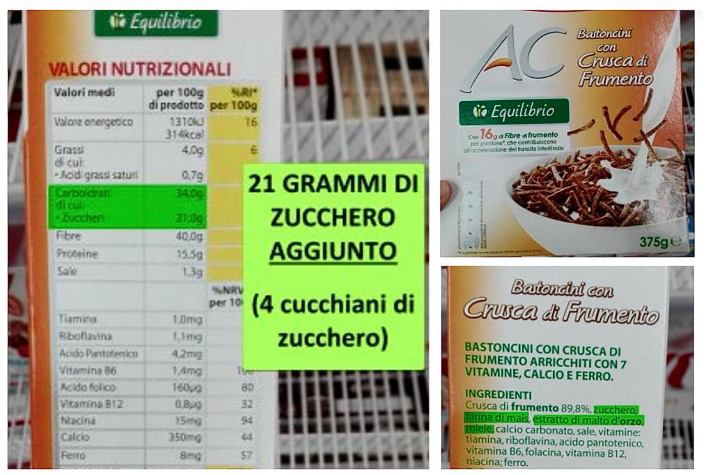 Una categoria leggermente differente di cereali per la colazione è rappresentata dai bastoncini di crusca (di avena o frumento), che in teoria si denota come un prodotto un po’ più sano in quanto dovrebbe contenere solamente le fibre del cereale, che sono un elemento nutrizionale di grande valore per la salute. Ma solo in teoria questi prodotti vengono confezionati con le fibre, purtroppo. In pratica anche qui assistiamo ad una preparazione un po’ ingannevole e fuorviante per i consumatori, dal momento che non solo viene aggiunto tanto zucchero anche in questi prodotti (non meno di 20 g di zucchero su 100g), ma vengono addizionati anche con farine di mais o amidi. Pertanto, se il consumatore è convinto di acquistare “bastoncini di crusca di frumento (o avena)”, perchè sul frontale della confezione si ritrova a leggere proprio questa dicitura, nella realtà dei fatti acquista invece un prodotto arricchito di zuccheri e farina raffinata. Ecco ad esempio uno di questi prodotti appena descritti, come si può notare dalle immagini sottostanti: