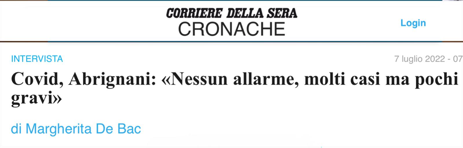 Nell’articolo-intervista originale su il Corriere si legge chiaramente che Abrigiani “osserva il progressivo indebolimento della pandemia, più diffusiva, ma meno aggressiva”. Che non c’è nessun allarme, poiché anche se i contagi salgono i casi gravi sono molto pochi. Ed anche che non ha senso fare allarmismo sui dati quotidiani, poiché spesso sono soggetti a oscillazioni tanto da rendere le interpretazioni poco significative. «All’esplosione dei casi – si legge – non corrisponde quella dei pazienti che hanno bisogno di rianimazione. Mi sento di affermare che non è un’emergenza. E’ una fase di passaggio, delicata, che richiede questo sì attenzione e altro impegno organizzativo». Con l’integrazione di queste premesse le parole sul concerto dei Maneskin, seppur forti, appaiono molto meno allarmanti.