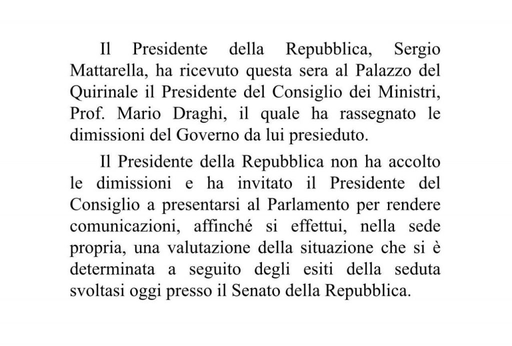 Sono iniziati i tempi supplementari del governo Draghi e della crisi politica che nelle prossime ore potrebbe ufficialmente trasformarsi in crisi di governo. Ieri, al Senato era attesa l’approvazione della fiducia posta dall’esecutivo sulla conversione in legge del decreto Aiuti. Il presidente del Consiglio ha incassato il consenso delle forze di maggioranza, fatta eccezione per il Movimento 5 Stelle, che al momento della votazione è uscito dall’Aula. Così, Mario Draghi ha raggiunto Sergio Mattarella per un breve incontro e poi è ritornato a Palazzo Chigi per il Consiglio dei Ministri, dove ha annunciato le sue dimissioni. Alle 19.15 è salito al Quirinale per porre fine alla sua esperienza politica ma il presidente della Repubblica ha rifiutato le dimissioni, rinviandolo mercoledì alle Camere. A questo punto, gli scenari possibili sono diversi: dal rinnovo della fiducia alla conferma delle dimissioni, passando per le elezioni anticipate o un governo “traghettatore”. E l’ipotesi di uno strappo mediatico – al sapore di atto finale – da parte del M5S non può essere esclusa.