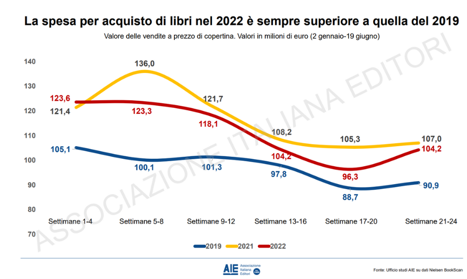 I dati parlano chiaro: rispetto al periodo pre pandemico leggiamo molto di più. Anche se i primi mesi del 2022 non sono riusciti ad eguagliare i numeri record del 2021 (come era prevedibile accadesse), gli italiani si dedicano molto di più alla lettura rispetto al 2019. Secondo le stime raccolte dall’Associazione Italiana Editori (AIE), nei primi sei mesi di quest’anno l’editoria (dai romanzi ai saggi, acquistati nelle librerie fisiche e online e nella grande distribuzione) ha venduto il 3,6% di copie in meno rispetto all’anno scorso. Ma, rispetto al 2019, il dato resta positivo, con un 14,5% in più di copie vendute (pari a 670 milioni di euro, 30 milioni in meno rispetto al 2021 ma 86 in più rispetto al 2019).