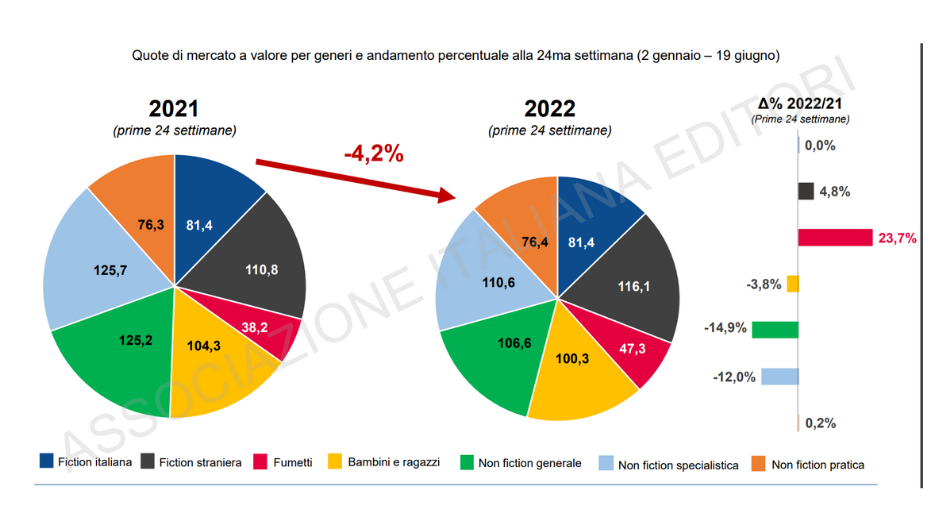Tuttavia le librerie online hanno venduto nei primi sei mesi libri per 284,8 milioni a prezzo di copertina: cifre che, a livello di quote di mercato, si traducono per le librerie online in una discesa dal 47% al 42,5% (cioè 43 milioni di ricavi in meno), mentre per quelle fisiche ad una risalita dal 47,8% al 52,8% (passate a 353,8 milioni, 21 milioni in più rispetto allo stesso periodo del 2021).