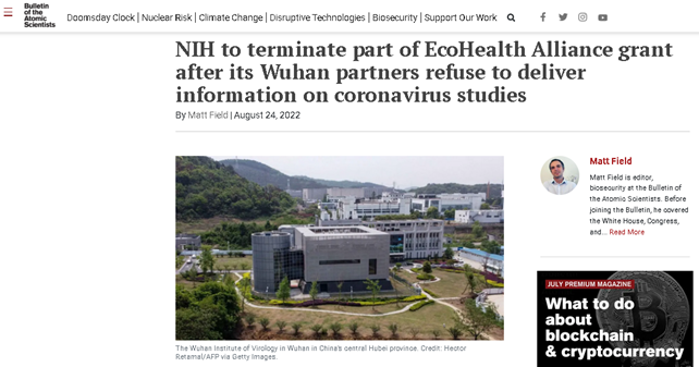[11] Field M. NIH to terminate part of EcoHealth Alliance grant after its Wuhan partners refuse to deliver information on coronavirus studies. Bulletin of the Atomic Scientists, https://thebulletin.org/2022/08/nih-to-terminate-ecohealth-alliance-grant-after-its-wuhan-partners-refuse-to-deliver-information-on-coronavirus-studies/ (2022, accessed September 8, 2022).