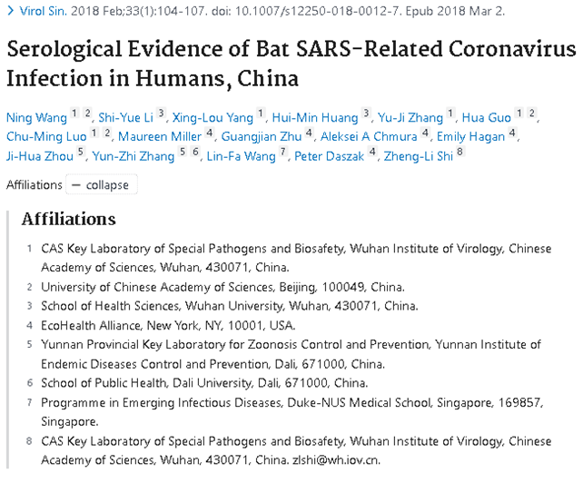 [8] Wang N, Li S-Y, Yang X-L, et al. Serological Evidence of Bat SARS-Related Coronavirus Infection in Humans, China. Virol Sin 2018; 33: 104–107.