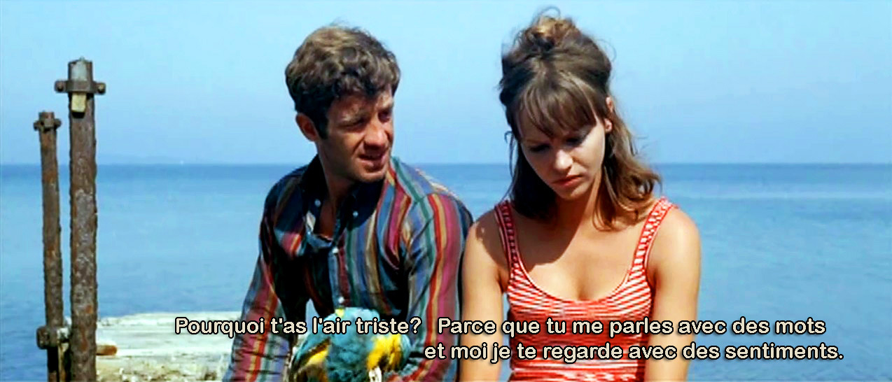 In questo modo, lo spettatore può tornare a “Guardare con i sentimenti” («Tu me parles avec des mots, je te regarde avec des sentiments» da una delle frasi più celebri di Pierrot le Fou, lungometraggio che il regista franco-svizzero realizzò nel 1965 in cui è evidente la spontaneità ricercata da Godard così come il distacco dal modo di comunicare del cinema classico).
