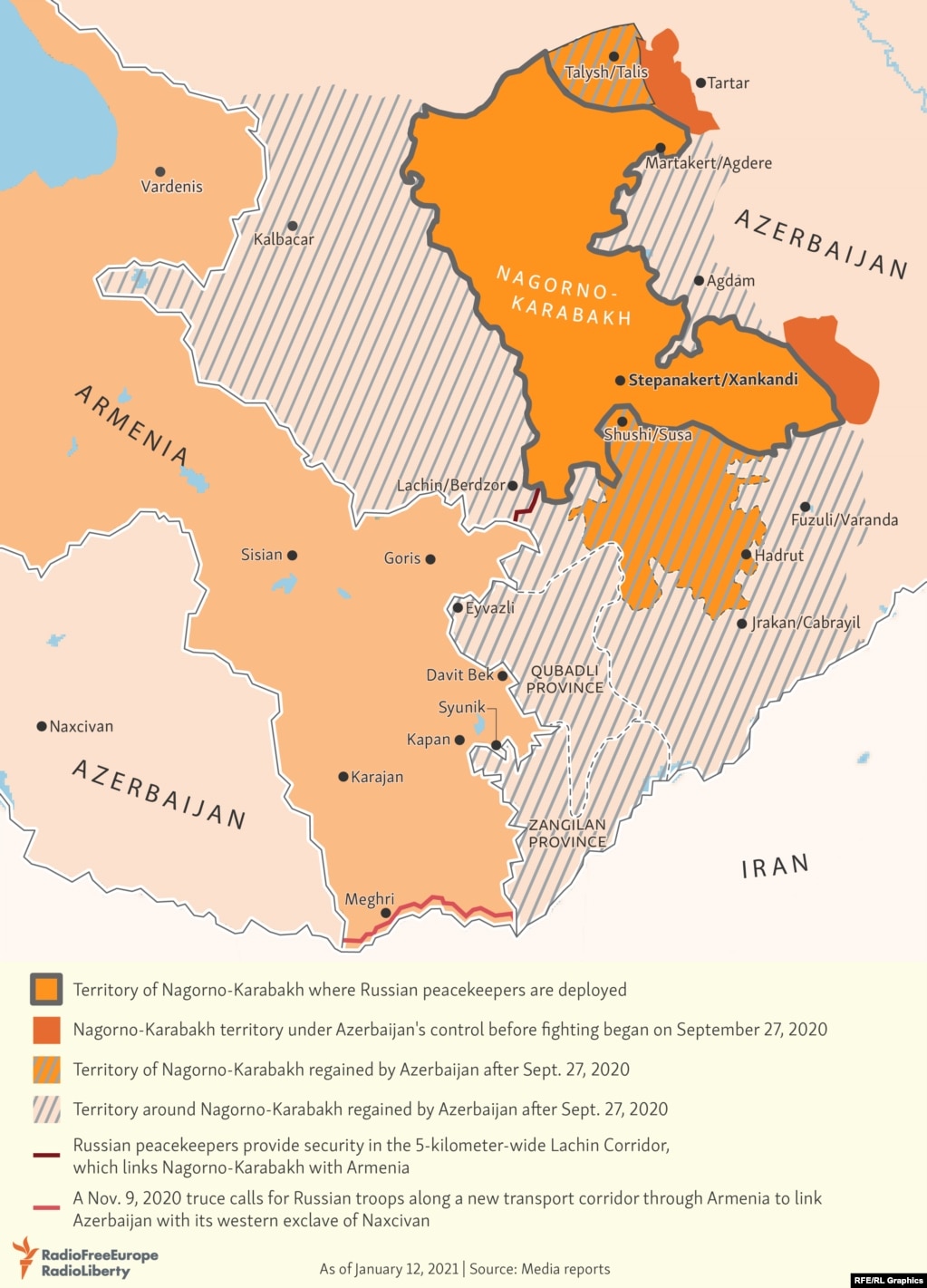 In realtà, definire una nuova guerra un eventuale conflitto tra le due ex repubbliche sovietiche non è del tutto corretto, dato che i due paesi da tre decenni si contendo la sovranità sul Nagorno-Karabakh, una regione abitata in maggioranza da armeni, all’interno dell’Azerbaigian. Le tensioni per il Nagorno-Karabakh risalgono ai primi anni ’90, quando a seguito di una guerra tra i due paesi, le milizie armene riuscirono ad ottenere non solo il controllo della regione ma anche di alcune aree limitrofe, causando lo sfollamento di migliaia di azeri che in quelle zone vivevano. Da allora il Nagorno-Karabakh e quei territori occupati sono stati amministrati da un governo locale supportato dall’Armenia. Nel 2020, a seguito di un imponente offensiva l’Azerbaigian riuscì a riottenere il controllo di tutte le zone che aveva perso negli anni ’90, oltre a riconquistare anche piccole parti del Nagorno-Karabakh stesso. La guerra, che durò poco più di un mese, causò la morte di 7.000 persone costringendo migliaia di armeni ad abbandonare le proprie case. Grazie alla mediazione della Russia, il 9 novembre 2020 i due paesi arrivarono a siglare un armistizio, che per garantirne la durata, prevedeva anche l’invio di un contingente di forze di pace russe nel Nagorno-Karabakh.