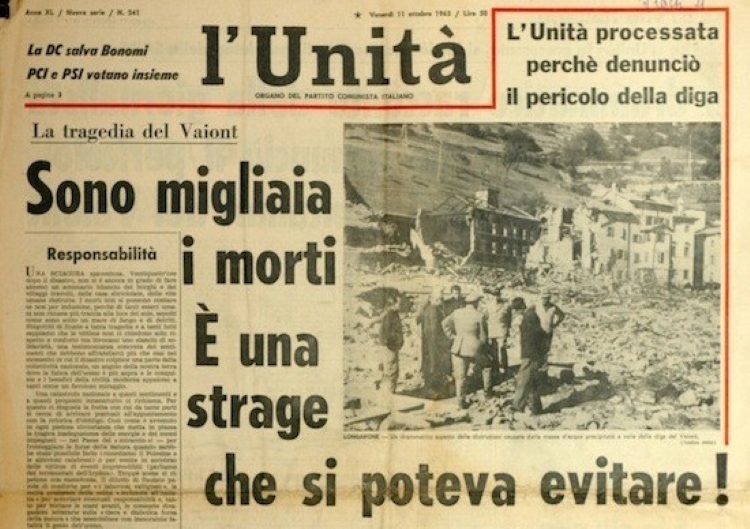 Un mare di acqua che si è polverizzato in goccioline, un temporale in un firmamento stellato, prima di abbattersi per terra con la forza di due bombe atomiche. 50 milioni di metri cubi di liquido, sassi, terra, alberi, venuti giù con tutto quello che hanno trovato e frullato sul proprio cammino. Un’onda alta come dieci palazzi di dieci piani, un inferno precipitato come la fine del mondo mentre al bar erano tutti davanti alla tv per una partita di Coppa dei Campioni, da quella enorme diga che faceva il solletico al cielo, coi suoi 261 metri e sessanta centimetri. Un’opera perfetta nel posto sbagliato, appoggiata su una montagna di pastafrolla, spaccata da una frana gigantesca e antica, risvegliata e inesorabilmente diretta verso il basso coi suoi 270 milioni di metri cubi. La diga ad arco doppio più alta del mondo, un orgoglio italiano, e tutti gonfiavano il petto e battevano le mani. Tutti, tolti quelli che ci vivevano sotto, davanti e intorno. Loro non battevano le mani e non erano per nulla tranquilli. Anzi, avevano una paura maledetta, a dirla tutta.