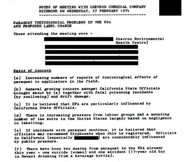 I documenti dimostrano inoltre che gli addetti ai lavori temevano di dover affrontare conseguenze legali per gli effetti cronici e a lungo termine del paraquat già dal 1975. Uno scienziato dell’azienda definì la situazione “un problema abbastanza terribile” per il quale “si poteva fare qualche piano…”. Dopo quasi 50 anni, quei timori si sono dimostrati reali: migliaia di persone stanno facendo causa a Syngenta, sostenendo di aver sviluppato il Parkinson a causa degli effetti cronici dovuti all’esposizione a lungo termine al diserbante. Oltre a Syngenta si trova sotto accusa anche Chevron USA, una società che ha distribuito il paraquat negli Stati Uniti fino al 1986. Tra le carte prese in esame dal Guardian ci sarebbero relazioni interne, memo scritti a mano e dattiloscritti, presentazioni aziendali ed e-mail tra scienziati, avvocati e dirigenti dell’azienda, tutti parte della documentazione richiesta dal tribunale per il processo.