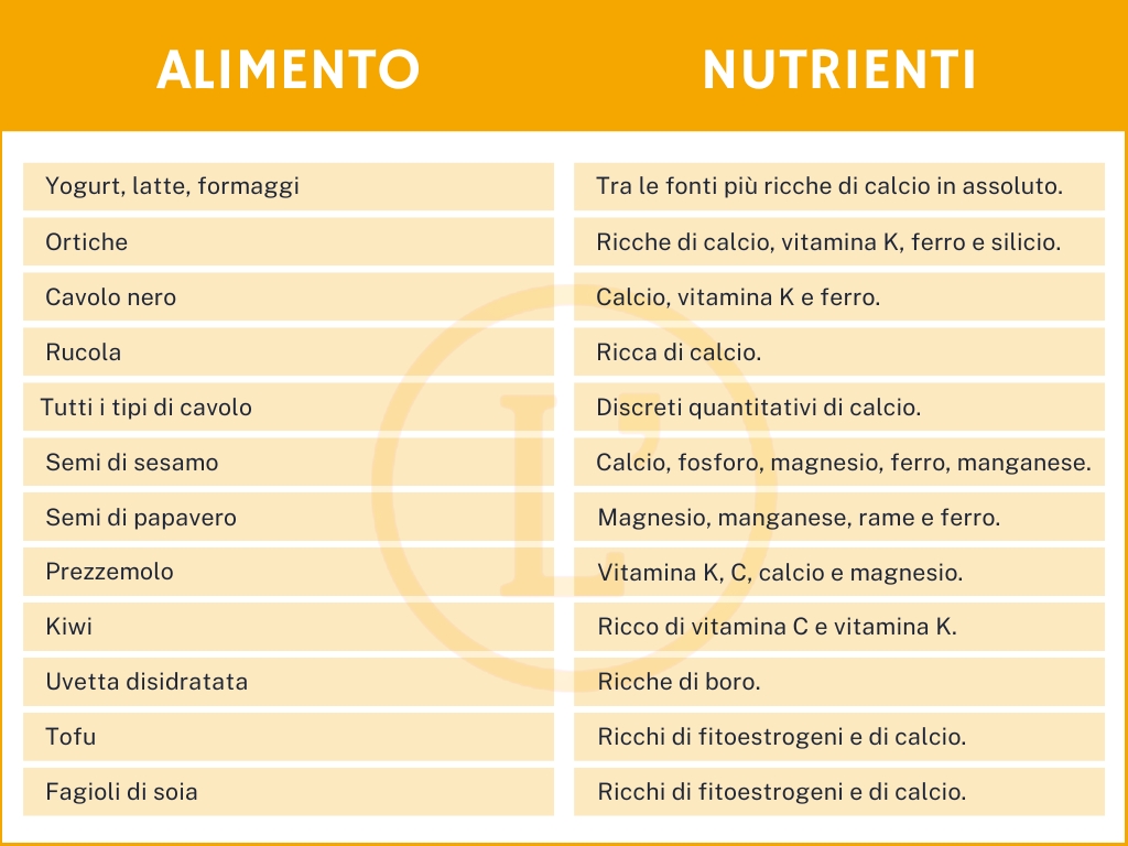 Dopo aver chiarito con il nostro specchietto riassuntivo quali siano i nutrienti e le sostanze utili o nocive per la salute delle ossa, andiamo ora ad elencare gli alimenti che contengono questi nutrienti per conoscerli meglio e saperli utilizzare nel modo giusto nella nostra dieta.