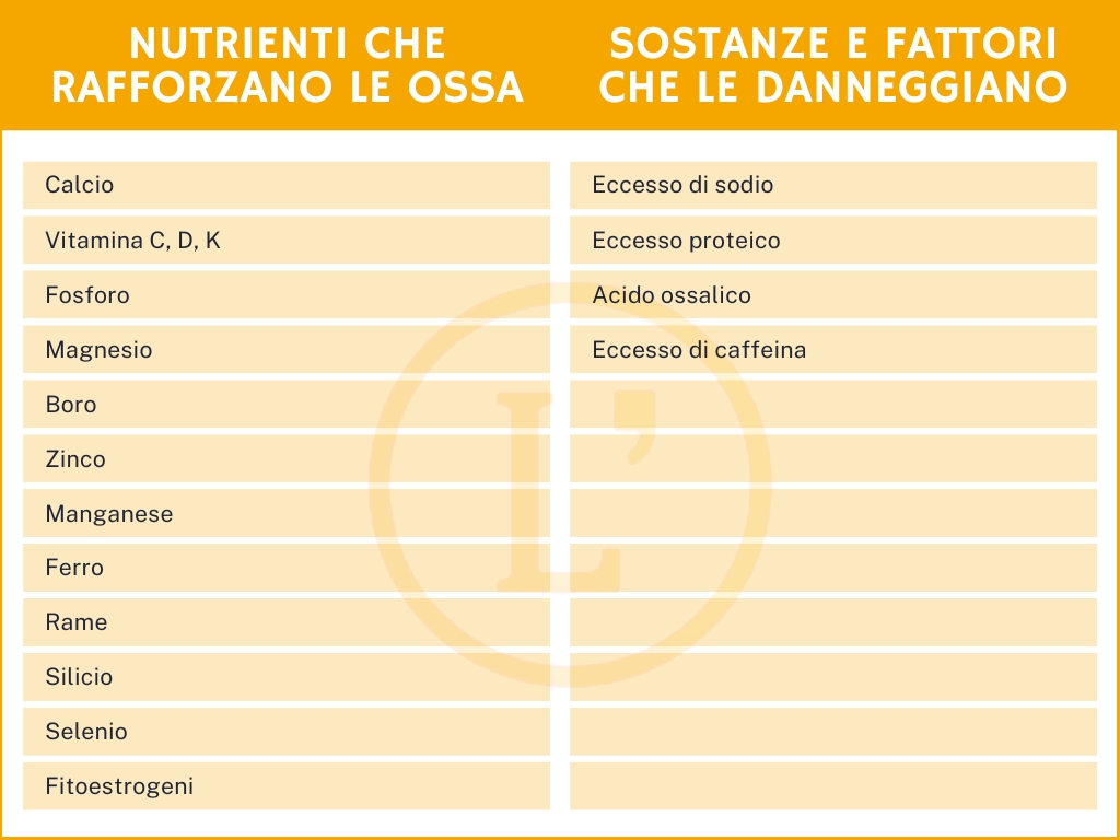 Fornirò innanzitutto uno schema di sostanze che nutrono l’osso, in modo diretto o indiretto, e di sostanze che invece all’opposto lo possono indebolire, così da tenerle in considerazione in maniera chiara.