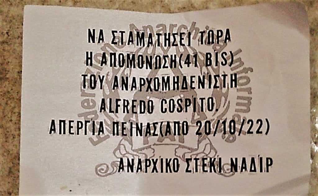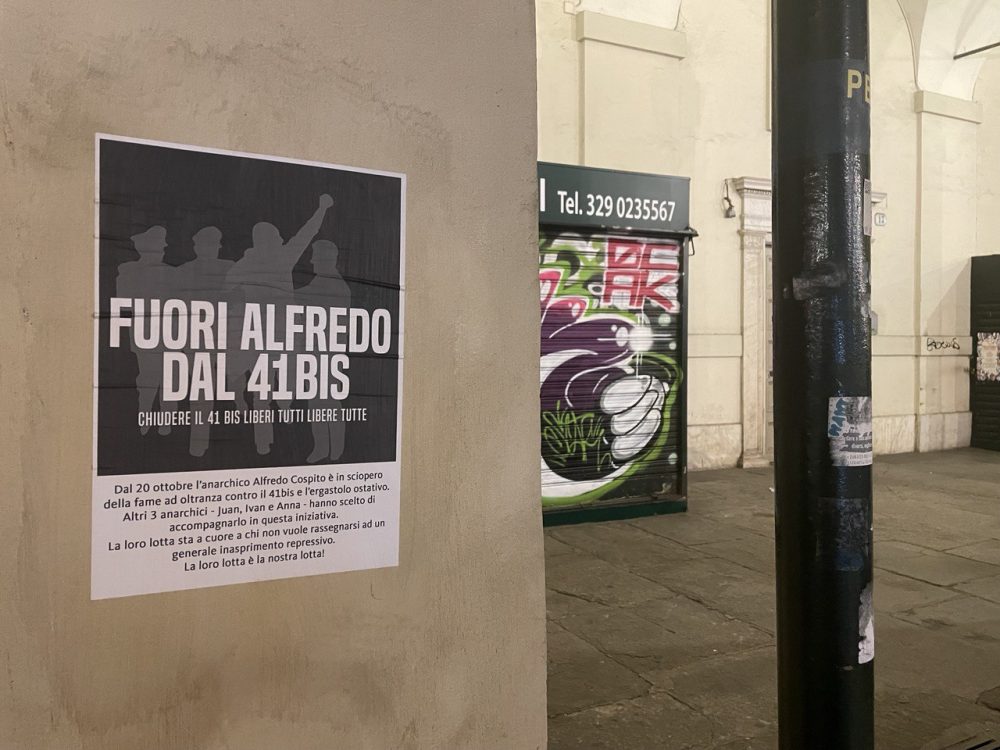 È giunto al quarantaquattresimo giorno di sciopero della fame Alfredo Cospito, anarchico recluso in isolamento nel carcere di Bancali (Sassari) deciso in questo modo a protestare contro il regime di 41 bis, ovvero il “carcere duro”, cui è stato sottoposto dallo scorso maggio. Nella giornata di ieri il suo caso è arrivato al Tribunale del Riesame di Roma, che dovrà decidere sul provvedimento di applicazione del regime detentivo di 41 bis per i prossimi quattro anni. A ccusato, nell’ambito del processo Scripta Manent, di aver collocato due ordigni a bassa intensità nella Scuola Allievi Carabinieri di Fossano (Torino) i quali, esplosi in orario notturno, non causarono né morti né feriti. Al termine del processo Cospito si vide condannato a 20 anni di reclusione per 280 c.p., ovvero Attentato per finalità terroristiche o di eversione dell’ordine democratico, riqualificato nel luglio 2022 in 285 c.p., Devastazione, saccheggio e strage ai danni dello Stato, il reato più grave del nostro ordinamento, per il quale è previsto l’ergastolo, anche ostativo (il cosiddetto “fine pena mai”), pur in assenza di vittime. Non vennero condannati per questo reato nemmeno gli autori delle stragi di Capaci e via d’Amelio, né quelli di piazza Fontana o dell’attentato alla stazione di Bologna. Nel maggio 2022, in anticipo sulla riqualificazione del reato, Cospito viene sottoposto a regime speciale di 41 bis o.p. e trasferito al carcere di Bancali, in provincia di Sassari. A motivare l’applicazione del regime di carcere duro vi sarebbe la corrispondenza che l’anarchico ha intrattenuto in questi anni, sempre alla luce del sole, con riviste e militanti del movimento anarchico. Per la libertà di Cospito e in generale contro il regime carcerario del 41 bis si sta sviluppando un movimento di solidarietà internazionale, che oltre all’Italia ha registrato nelle ultime settimane campagne e manifestazioni in Grecia, Cile e diversi altri Paesi.