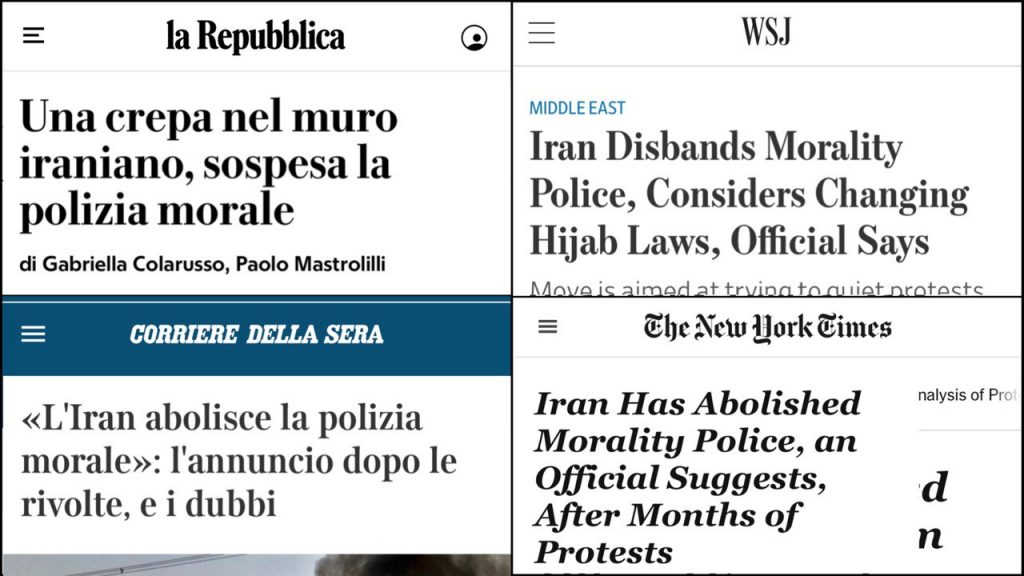 Nonostante ciò, negli ultimi giorni la notizia dello smantellato della polizia morale è circolata su gran parte dei giornali italiani e internazionali, a partire da testate come il Wall Street Journal e il New York Times. Gli esperti di Iran e gli attivisti hanno inizialmente invitato alla prudenza, criticando poi aspramente come “fuorvianti”, “vergognosi” e “fake news” i contenuti condivisi dai principali media occidentali. Anche le agenzia di stampa e gli organi di stampa italiani hanno rilanciato la notizia come assodata: da Agi al Corriere della sera, da Repubblica a Il fatto quotidiano.