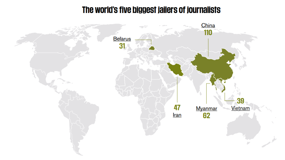 Oltre a Cina, Birmania e Iran, mettono a repentaglio la propria vita anche i reporter che decidono di raccontare il Vietnam (al momento sono 39 i giornalisti detenuti nel Paese) e la Bielorussia (che ne ha incarcerati 31). In generale, i tre quarti dei giornalisti incarcerati nel mondo sono per il 45% in Asia e per più del 30% nel Maghreb e nel Medio Oriente.