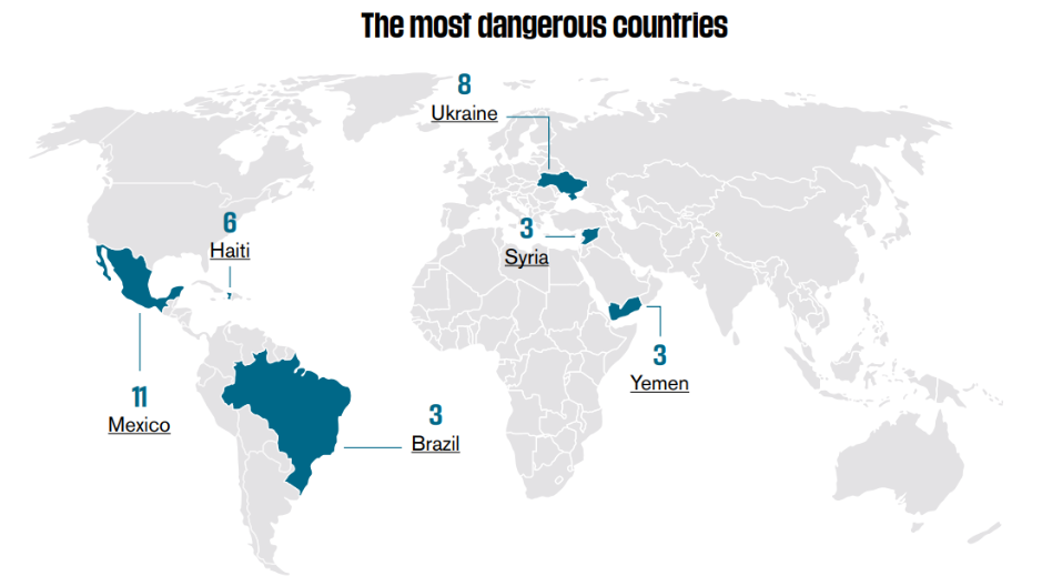 Tuttavia, a conti fatti, più della metà dei giornalisti uccisi quest’anno si trovavano in Paesi considerati “in pace”. Undici di loro, ad esempio, sono stati assassinati in Messico (il 20% del numero complessivo di giornalisti uccisi in tutto il mondo), 6 ad Haiti e 3 in Brasile. Il rapporto considera infatti le Americhe come “la regione più pericolosa del mondo per i media, con quasi la metà (47,4%) del numero totale di giornalisti uccisi in tutto il mondo nel 2022”.