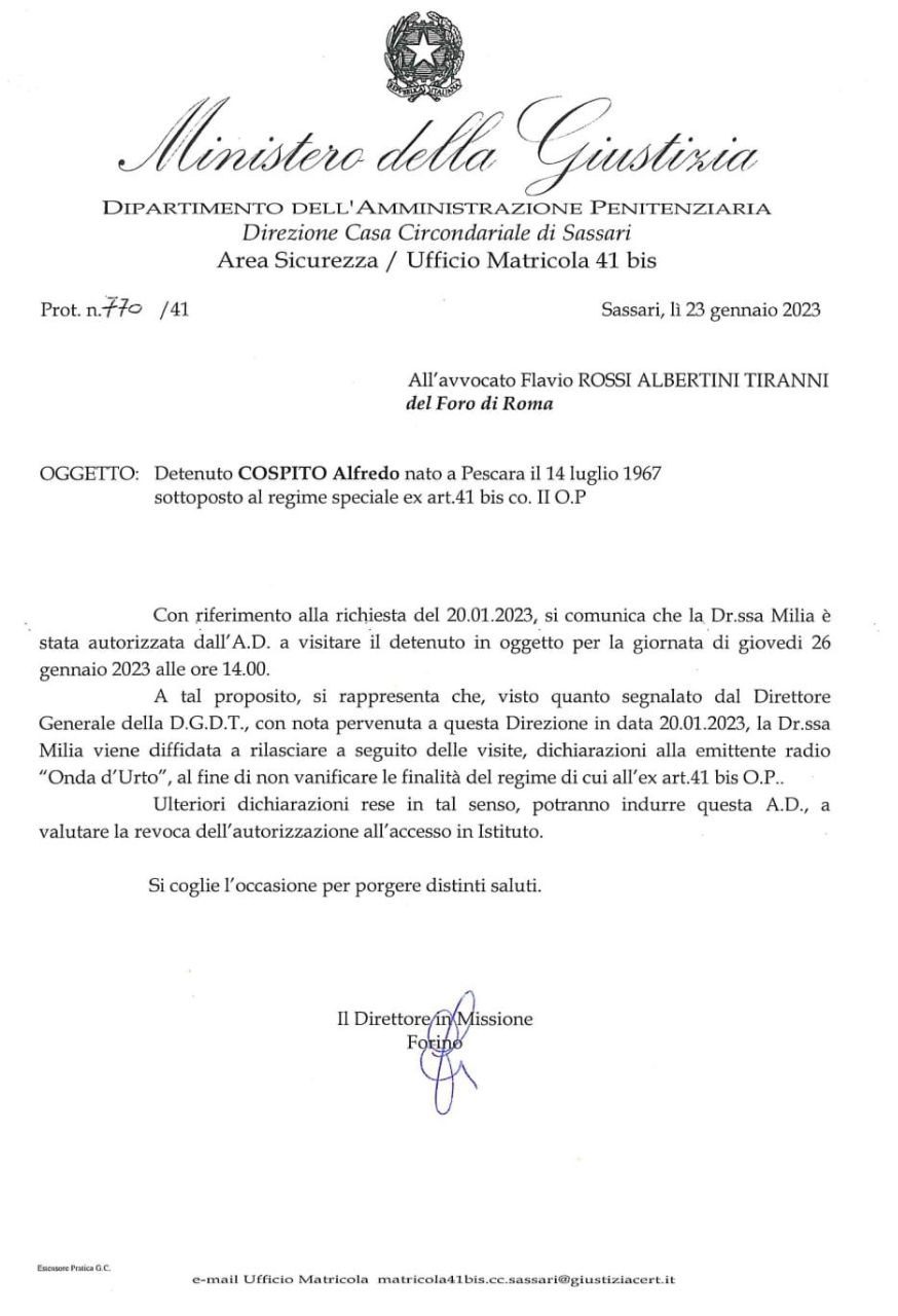La nota, indirizzata all’avvocato Flavio Rossi Albertini, legale di Cospito, autorizza in particolare la dottoressa Milia a visitare il detenuto il prossimo 26 gennaio, ma la diffida dal “rilasciare, a seguito delle visite, dichiarazioni alla emittente radio ‘Onda d’Urto’“. La motivazione annessa è “non vanificare la finalità del regime di cui all’ex art.41 bis O.P.”. Il documento si riferisce ad alcune interviste andate in onda sull’emittente radiofonica, nelle quali la dottoressa si limitava a parlare strettamente della salute dell’anarchico, senza aggiungere riflessioni sulle conseguenze sulla salute legate al particolare regime detentivo o alle motivazioni della protesta. In chiusura, nel documento viene specificato che “ulteriori dichiarazioni rese in tal senso” potrebbero comportare “la revoca dell’autorizzazione all’accesso in Istituto” per il medico.