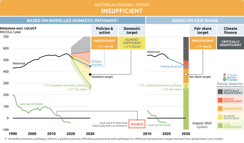 Il governo, eletto nel 2022, è salito al potere promettendo un’azione più forte sul clima, in un Paese ancora fortemente legato ai combustibili fossili. Ma, ad oggi, le sue politiche climatiche sono state classificate dal Climate Action Tracker come ancora “insufficienti”, visto che: le emissioni australiane rappresentano l’1,5% di quelle globali e se si aggiungono quelle indotte dall’export di carbone (2,9%), di cui il Paese è il maggior esportatore e LNG (0,6%), di cui detiene il 20% delle quote mondiali, l’Australia sarebbe responsabile del 5% della CO2 immessa nell’atmosfera.