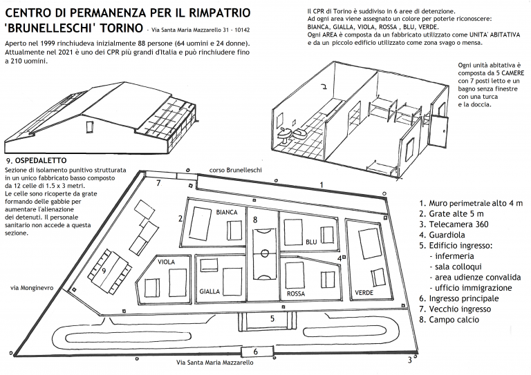 A Torino, le reti che circondano le aree sono alte più di cinque metri. Il muro che circonda la struttura, quattro. Torrette di guardia agli angoli, e in una delle aree (Ospedaletto, l’isolamento), chiuso in seguito alla morte di Moussa Balde nel maggio del 2021, le maglie di metallo si chiudono anche sopra. «Sembrava di essere in un pollaio», dice chi c’è passato. Era una sezione dove venivano rinchiusi coloro che si trovavano in punizioneNella pura teoria era un luogo di isolamento sanitario. Nella pratica era una camera di tortura psicologica. E anche fisica, dato che avvenivano spesso lì i pestaggi.