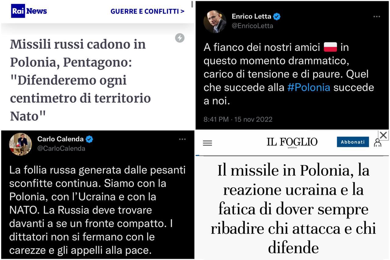 Facciamo solo un esempio. Il 15 novembre scorso, un missile vagante è caduto in territorio polacco, abbattendo una fattoria e uccidendo due persone. La prima agenzia a lanciare la notizia è Associated Press, dopo che uno dei suoi giornalisti ha dichiarato di aver avuto conferma da una sua fonte – ritenuta autorevole – del fatto che il missile fosse russo. Il fatto rimbalza su quasi tutti i principali quotidiani, i quali cavalcano l’entusiasmo una notizia che si presta perfettamente alla propaganda atlantista che hanno scelto di portare avanti, alimentando il panico in milioni di persone e potenzialmente esacerbando le tensioni geopolitiche. Basteranno pochissime ore per arrivare alla conclusione che, con tutta probabilità, il missile era ucraino.