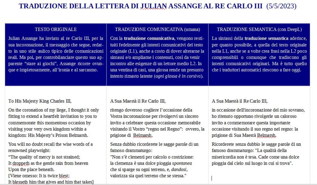 Ne sono la dimostrazione le recenti traduzioni in italiano della lettera di Julian Assange al Re Carlo III del Regno Unito – quelle che sono apparse su alcuni mass media in Italia. Con poche eccezioni, le redazioni si sono avvalsi di un traduttore automatico (di solito DeepL, che fornisce traduzioni istantaneamente) per essere in grado di diffondere subito la lettera in lingua italiana. Ma con quali risultati?