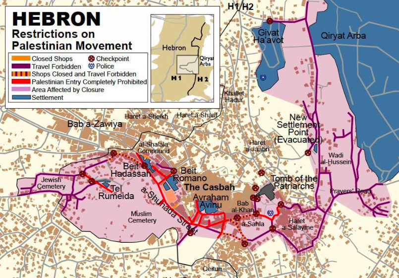 [Mappa del centro di Hebron, con in evidenza le restrizioni al movimento per i palestinesi]