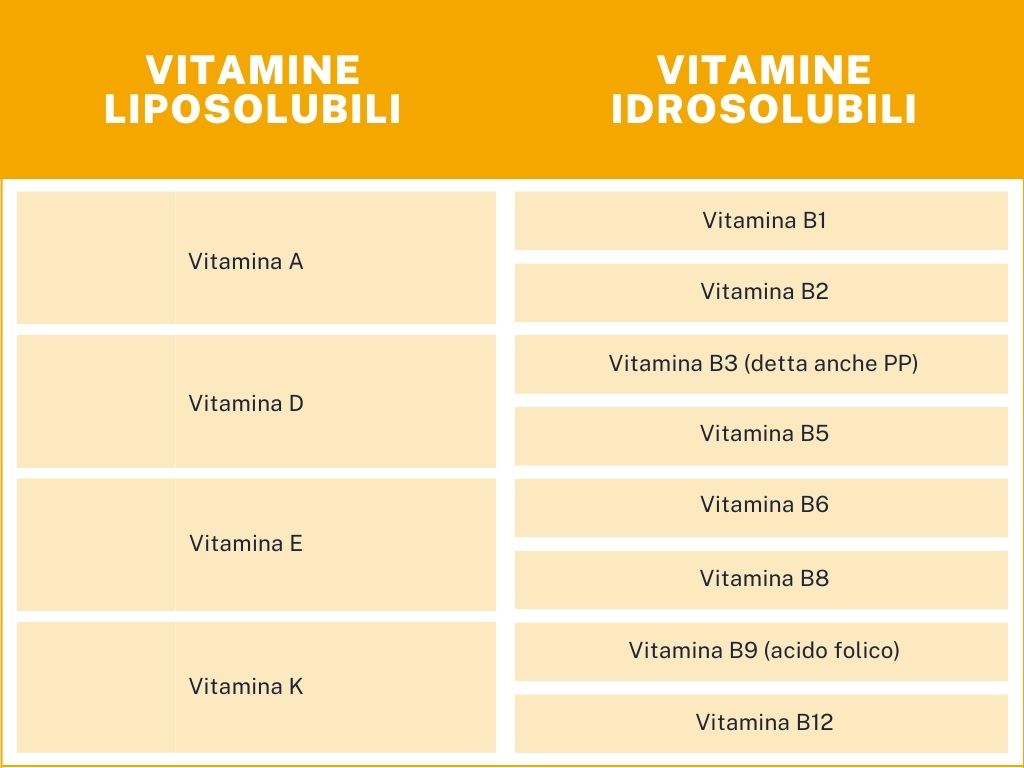 Le vitamine sono state classificate in base a 2 categorie: liposolubili (cioè dissolvibili nei grassi del nostro corpo) o idrosolubili (dissolvibili nell’acqua all’interno del nostro corpo).