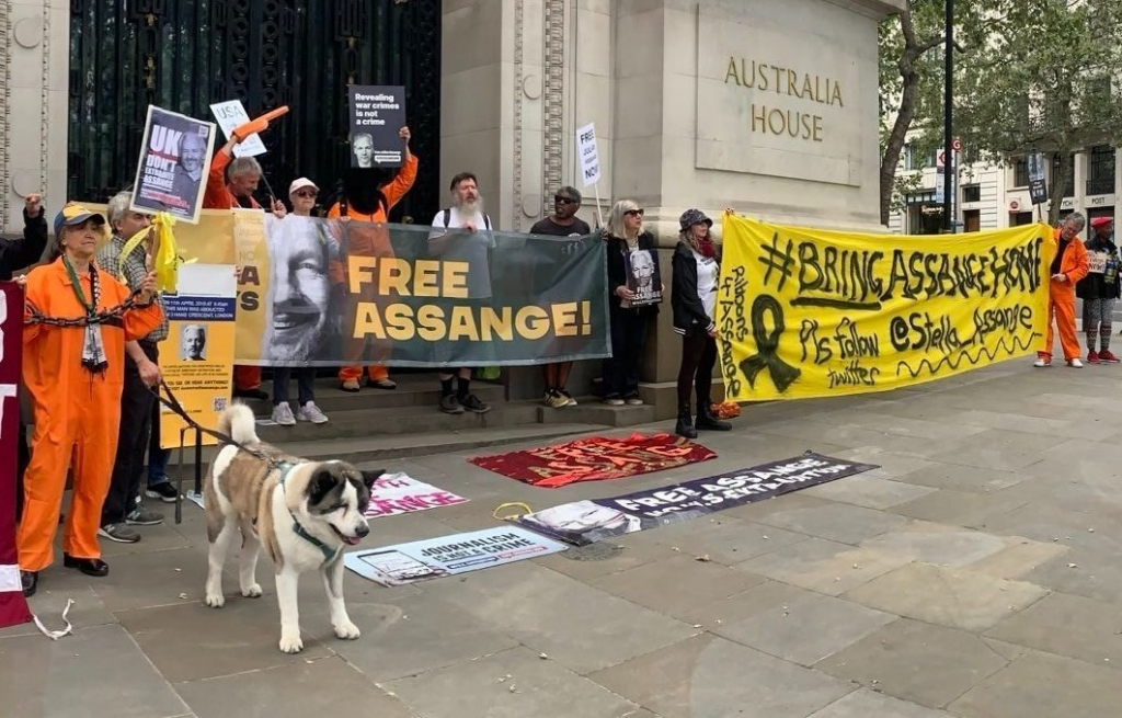 Nella capitale britannica, una dozzina di manifestanti del Team Assange London si sono riuniti sulla Strand davanti all’Australia House per cantare «Albo [Albanese] mantieni la promessa elettorale! Liberate Assange!».