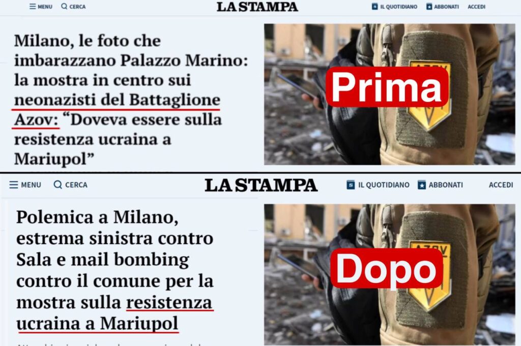 Per assecondare questa narrazione, La Stampa è stata vittima di acrobazie lessicali, dopo aver edulcorato il titolo di un articolo in cui si faceva riferimento esplicito ai “neonazisti del Battaglione Azov”, modificato poi in un più neutro “mostra sulla resistenza ucraina”. Da neonazisti a partigiani, il passo è stato breve.