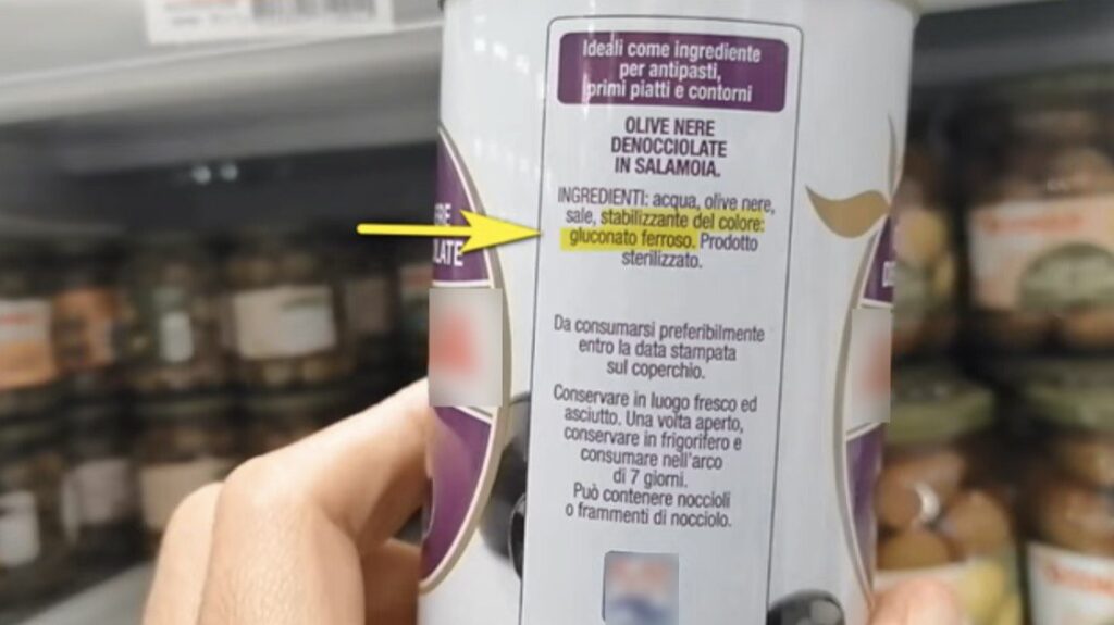 La verità è che le olive di colore nero (completamente nero) in natura quasi non esistono, ma si trovano invece le olive di marrone scurissimo o viola molto scuro, che sembrano nere ma non sono nere. Quelle che vediamo nere al supermercato si ottengono con un espediente chimico colorando delle olive verdi con una sostanza chiamata gluconato ferroso, che potete trovare elencata tra gli ingredienti del prodotto. Non si tratta di un colorante vero e proprio, ma di una sostanza derivante dalla ossidazione del ferro, che poi viene aggiunta alle olive a scopo di colorante.
